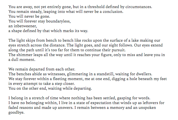 Waiting while departing 2018 Benches and tunnel man in BW by Truan Munro This text is part of the exhibition There was no thought, but a thrive for the visibility of something yet to be named. To see the video go here. Back